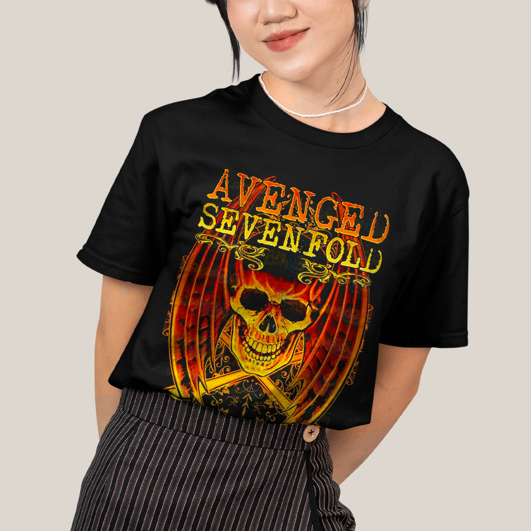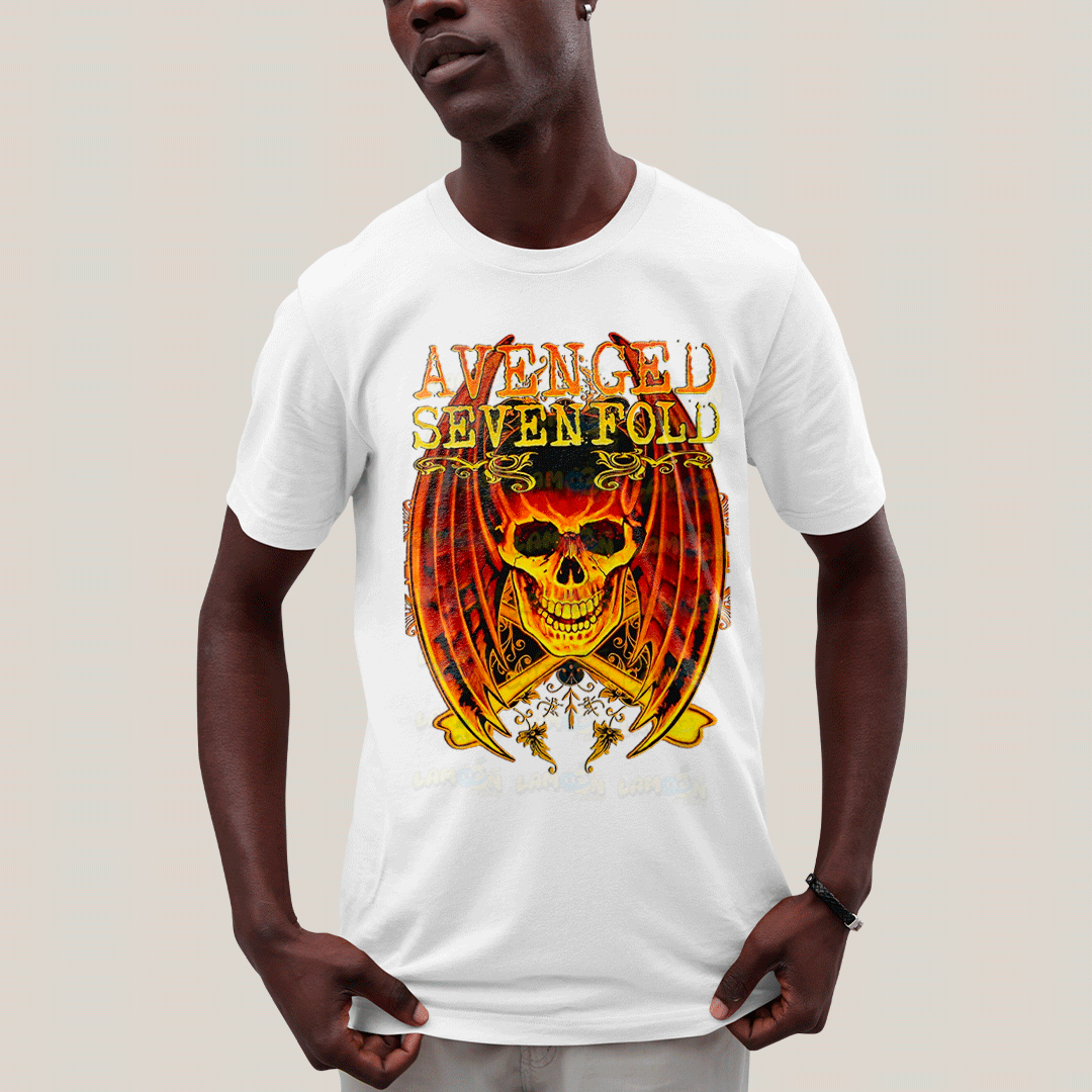 Camiseta Algodão Unissex T shirt- Avenged Sevenfold Esqueleto de Asas Laranja