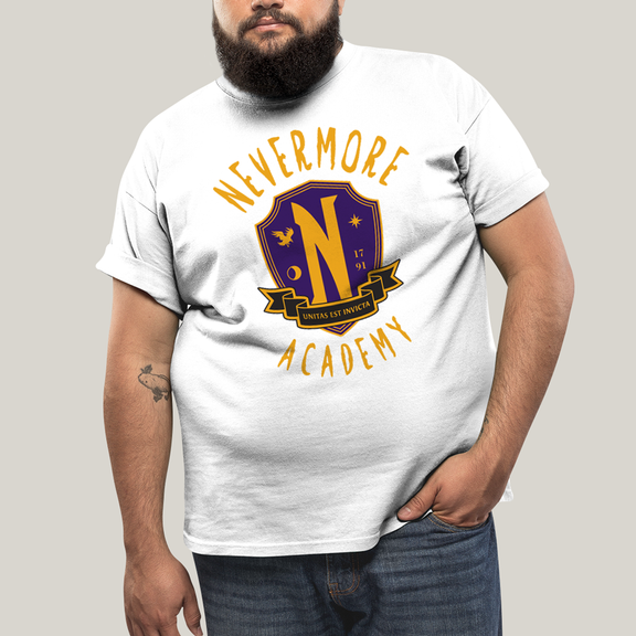Camiseta Plus Size Algodão Unissex T shirt Wandinha Unitas Est Invicta Nevermore Academy