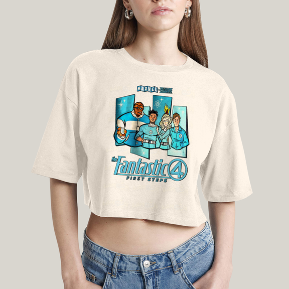 Cropped Oversized Algodão Unissex T shirt Quarteto Fantástico Primeiros Passos Cartunesco